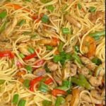 Jollof spaghetti with shrimp/veggies/chicken breast